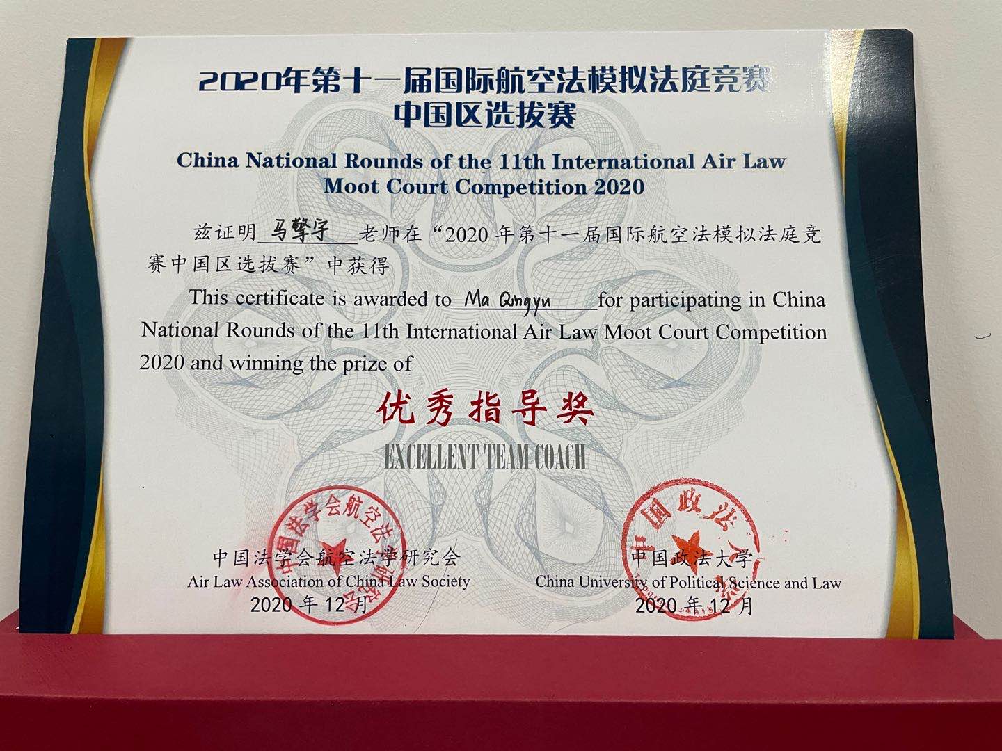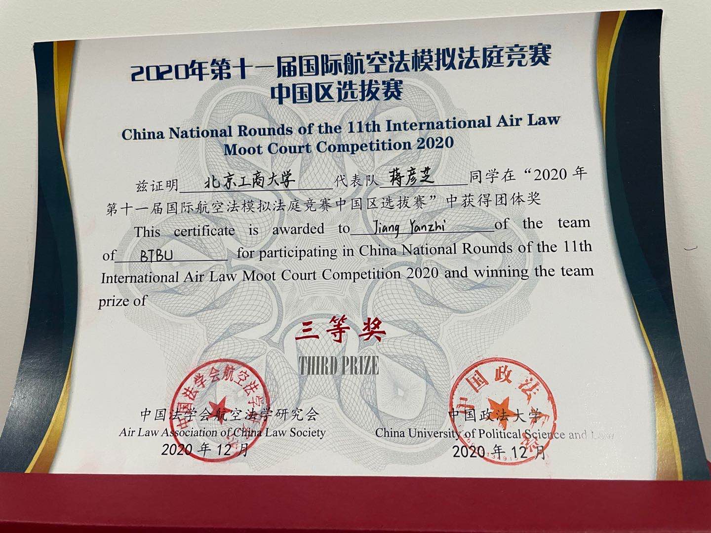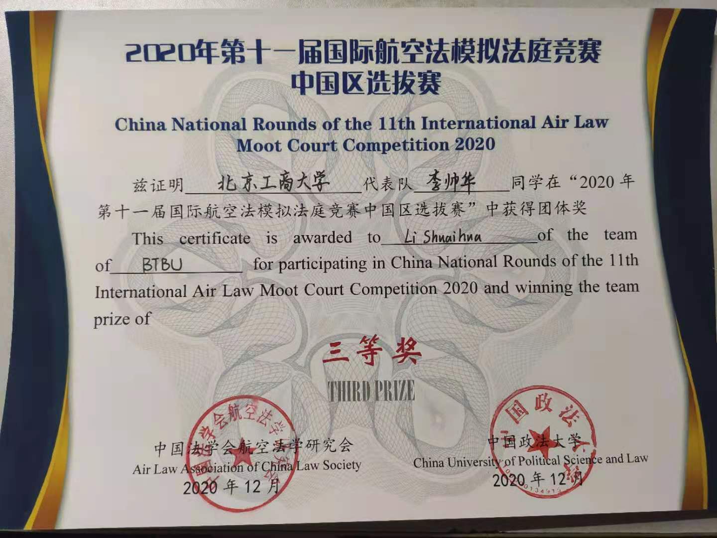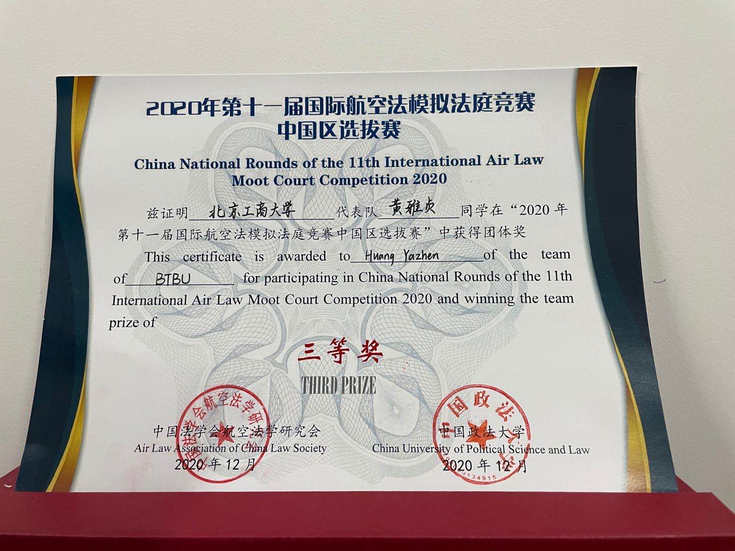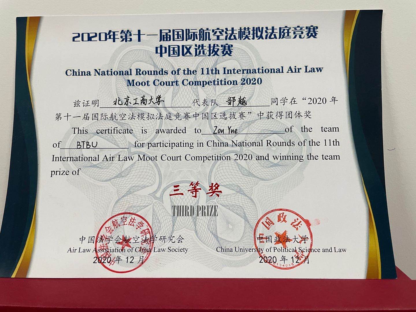 在刚刚结束的中国法学会航空法学研究会2020年年会上,“第十一届国际航空法模拟法庭竞赛中国区选拔赛”公布评审成绩。公司由yl88858永利集团组织的代表队荣获团体奖三等奖,国际法学系马擎宇老师获优秀指导奖。代表队由国际法学系马擎宇老师、刘禹老师等担任指导教师,参赛队员由18级研究生李帅华、17级本科生黄雅贞、邹越和蒋彦芝等组成。参赛队员在两位指导老师的指导下,从法律问题、论证分析到文书写作等多方面进行了高强度的训练与充分准备,展现了坚实的国际法知识和优异的团队合作能力,获得了组委会的一致好评。此次竞赛吸引了来自复旦大学、武汉大学、北京航空航天大学、北京理工大学、中国政法大学、华东政法大学、西北政法大学、中国民航大学、北方工业大学、首都经贸大学等13支代表队参加。公司代表队与武汉大学、复旦大学、北京航空航天大学等代表队同获三等奖。
