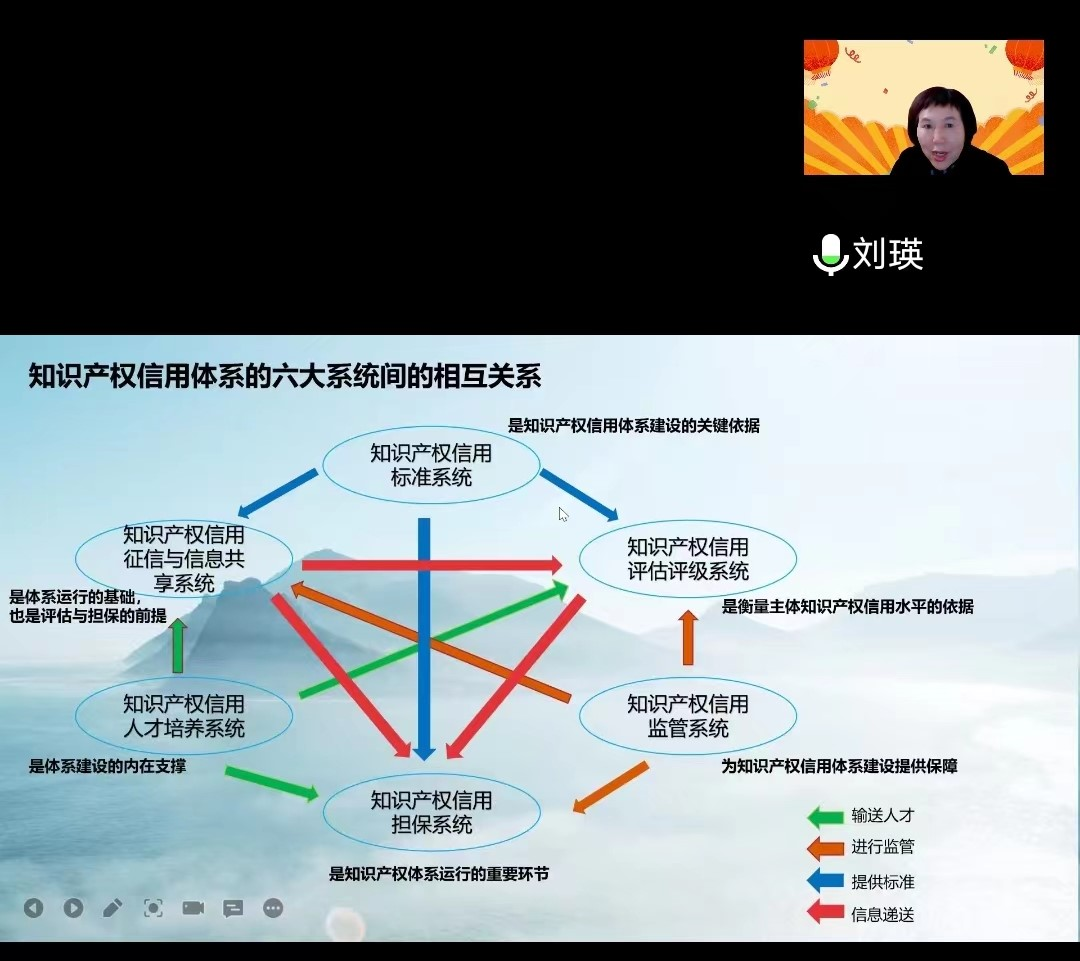 在本次讲座中,刘瑛教授围绕《数据要素为基础的知识产权信用体系建设》主题,主要讲解了两部分内容。第一部分介绍了知识产权信用在不同研究领域中的含义,阐述了知识产权信用作为道德准则、经济制度、法律制度的三个层次作用。第二部分分为四个方面展开:一是数据和知识产权信用的概念和特点;二是数据要素与知识产权信用的关系;三是数据要素基础下知识产权信用体系建设的诚实信用原则、开放共享原则、安全可控原则、维护市场公平竞争与保护科技创新原则;四是知识产权信用体系建设框架,包括知识产权信用标准系统、评级系统、监管系统、担保系统、人才培养系统、征信与信息共享系统六大系统。