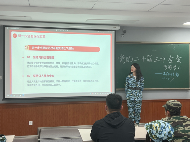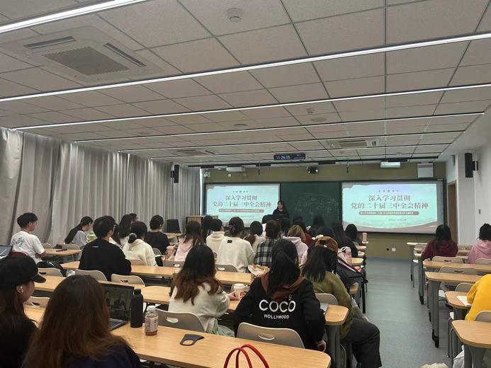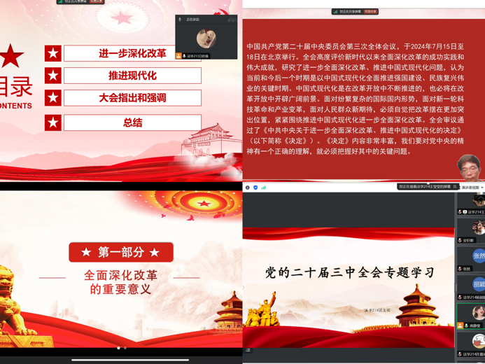 231、232支部通过小组讨论,观看视频等形式,提高全体成员的政治觉悟和思想认识。通过深入学习全会精神,大家进一步坚定了理想信念,不断推动自身工作和思想建设向更高水平迈进。212、214支部分别以高水平对外开放与生态文明建设的专题为中心展开学习。212支部通过PPT展示,重点讲解了高水平对外开放是对接国际高标准的制度型开放等六大特点。增强同学们对高水平对外开放体制机制的理解,激发大家对国家发展战略的思考与讨论。214支部组织同学们围绕人与自然和谐共生的现代化进行了交流,从中认识到了生态文明建设是关系中华民族永续发展的根本大计。