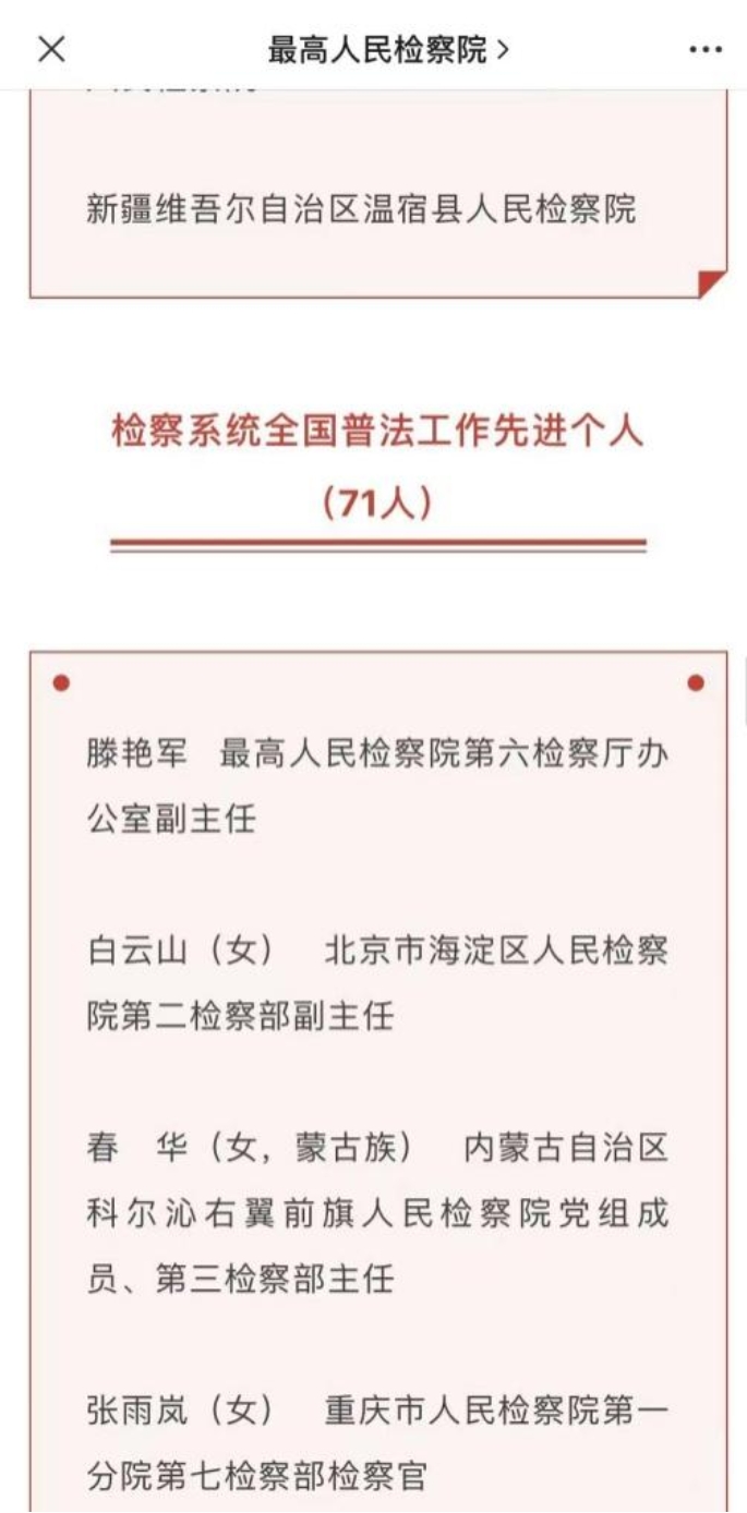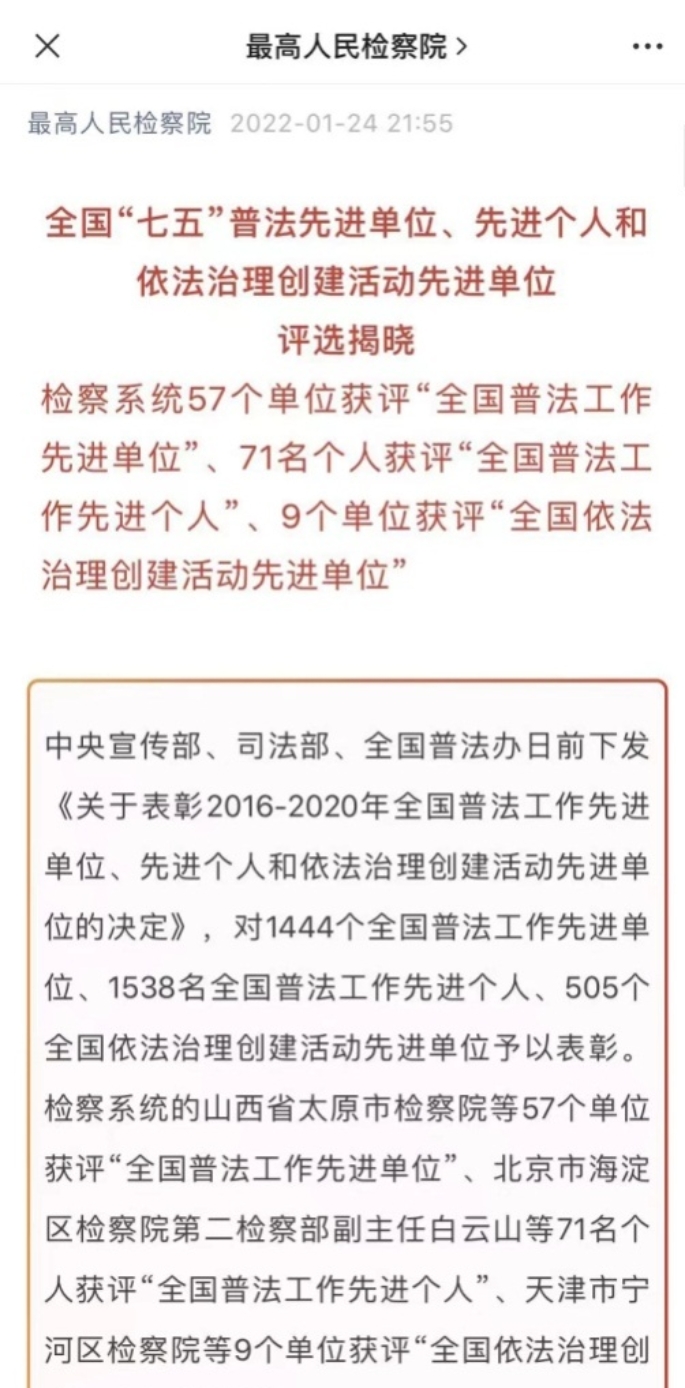 中央宣传部、司法部、全国普法办日前下发《关于表彰2016-2020年全国普法工作先进单位、先进个人和依法治理创建工作先进单位的决定》,对1444个全国普法工作先进单位、1538名全国普法工作先进个人、505个全国依法治理创建工作先进单位予以表彰。公司员工、北京市海淀区检察院第二检察部副主任白云山获评“全国普法工作先进个人”。