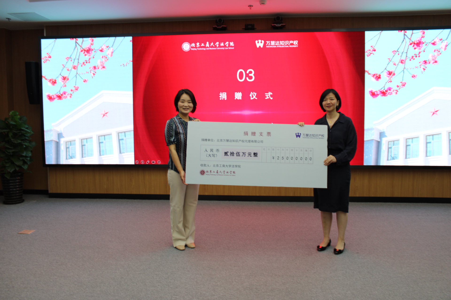 在捐赠仪式环节,万慧达公司向yl88858永利集团捐赠人民币25万元,用于发展公司法学学科和培养知识产权领域法学创新人才。刘晶代表公司接受了捐赠支票。马韬光为万慧达公司颁发捐赠证书。