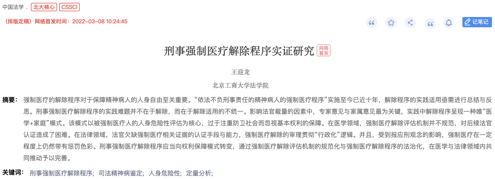 国内法学权威核心期刊《中国法学》2022年第2期刊登公司王迎龙副教授的研究论文《刑事强制医疗解除程序实证研究》,这是王迎龙副教授近年来发表的多篇法学核心期刊论文之一,也是公司科研工作的重大突破。