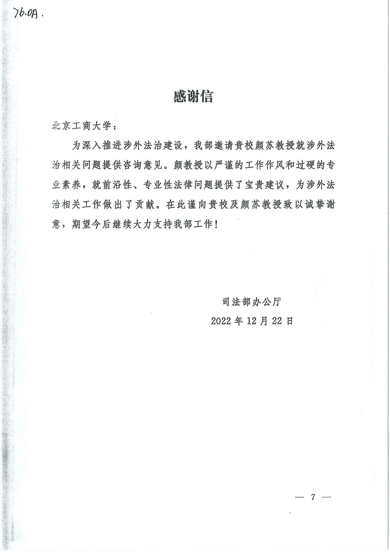 2022年12月22日,司法部办公厅发来感谢信,对公司颜苏老师为深入推进涉外法治建设,就涉外法治相关问题提供的宝贵咨询意见表示感谢。信中强调,颜教授以严谨的工作作风和过硬的专业素养,就前沿性、专业性法律问题提供了宝贵建议,为涉外法治相关工作做出了贡献。司法部在信中对公司老师的工作表达了充分的肯定与赞扬。